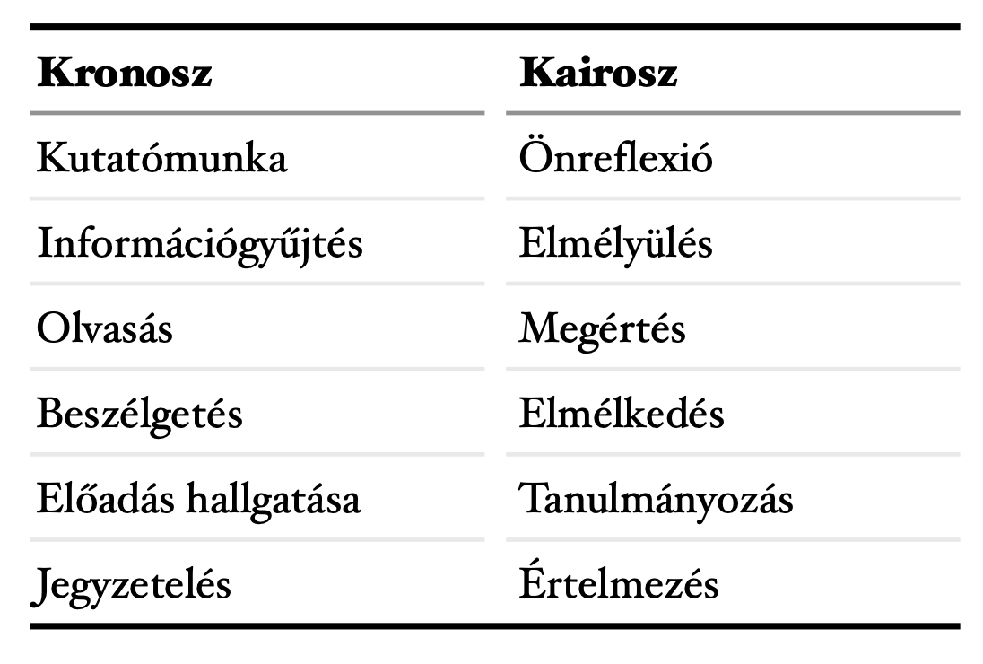 Az ókori görögök az időt kétféleképpen értelmezték. A kronosz az egymás utáni történések folytonos leírására szolgáló idő – úgymond a „folyó” idő. De minden eseményben vagy folyamatban van egy pillanat, ami rövid időre megszünteti az idő folyását. Ezt kairosznak hívták.